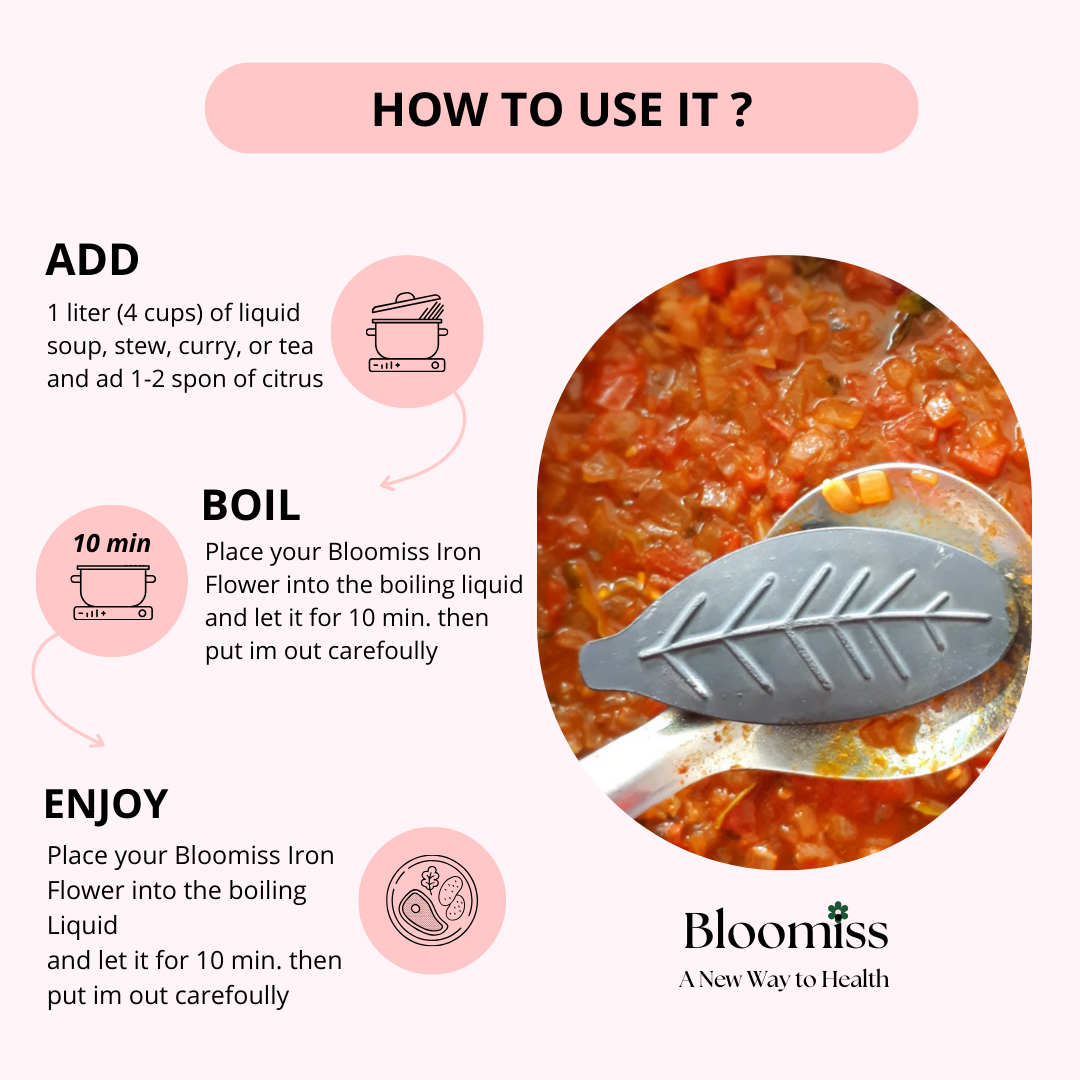 When added to the slightly acidified boiling liquid, the bloomiss Iron Leaf will release microscopic iron particles off its surface and into the liquid!