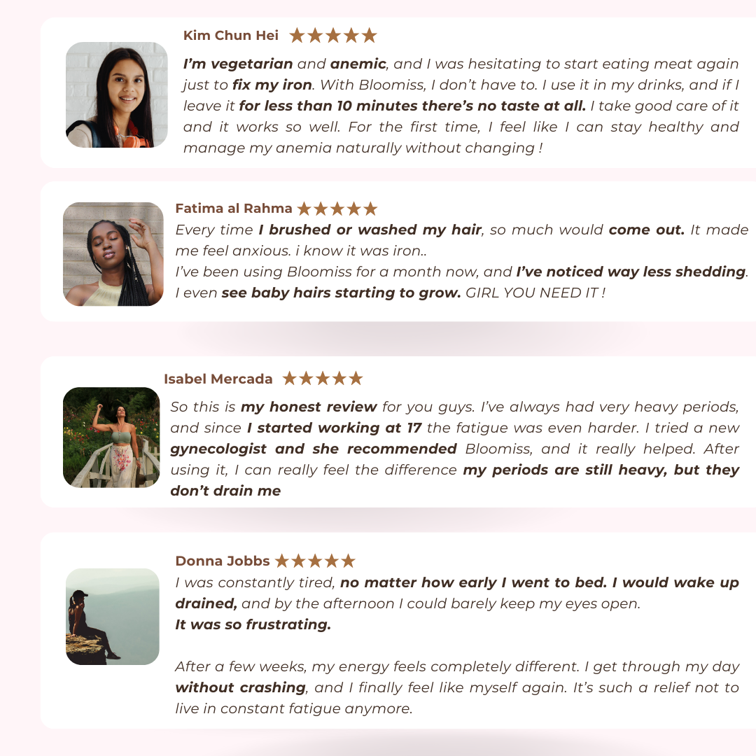 "I was constantly tired, no matter how early I went to bed. I would wake up already feeling drained, and by the afternoon I could barely keep my eyes open. It was really frustrating because I thought I was doing everything right. After a few weeks with Bloomiss, my energy feels completely different. I can get through my day without crashing, and I finally feel like myself again. It’s such a relief not to live in constant fatigue anymore.